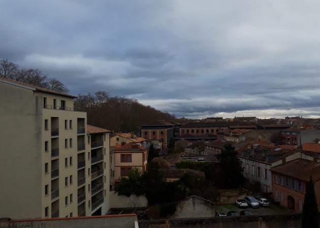 La chambre ne donne pas sur la rue mais sur la coursive avec vue sur le pont Saint Pierre (cf photo). Elle est meublée: un lit deux places, un placard, une colonne de rangement, un bureau (la taille communiquée est approximative je n'ai pas les superficies individuelles des pièces).