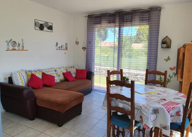 Maison de plein pied , 2 chambres, salle de bain (baignoire/douche), wc, kitchenette, coin repas, salon.