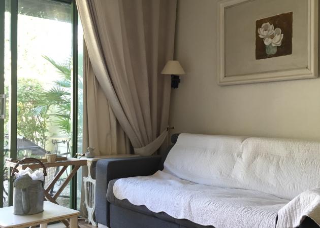 Petite maison pour 4 personnes, comprenant une pièce à vivre principale avec possibilité de couchage de deux personnes (type clic-clac ou autre+ écran LCD), une kitchenette attenante (type "à l'américaine), équipée (refrigérateur, deux plaques de caisson et four électrique, micro-ondes, vaisselles, bouilloire et cafetière électrique), une chambre independante couchage pour deux personnes, une salle de bain (baignoire+ seche cheveux), toilettes indépendantes, un patio privatif de 25 m² avec tables et chaises d'extérieur, transats