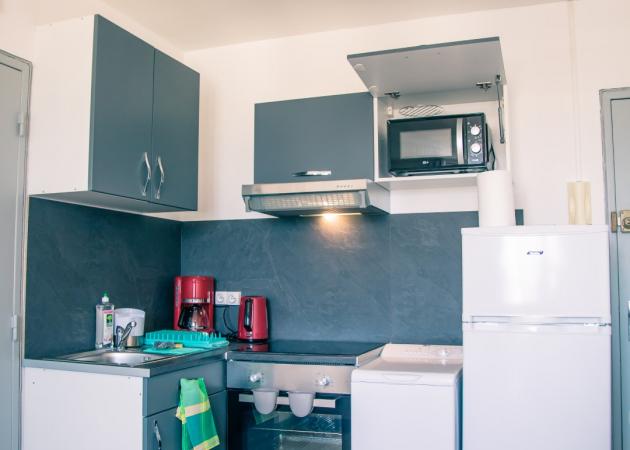 → Cuisine équipée: four, micro-ondes grill, frigo, vaisselle