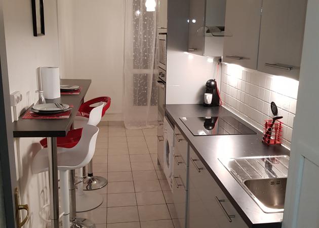 Cuisine toute équipée jusqu au grille pain, le Dolce Gusto, la bouilloire entre autres. Lave Lave-vaisselle, lave linge séchant, plaque induction, hotte , four et four micro onde.