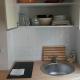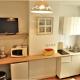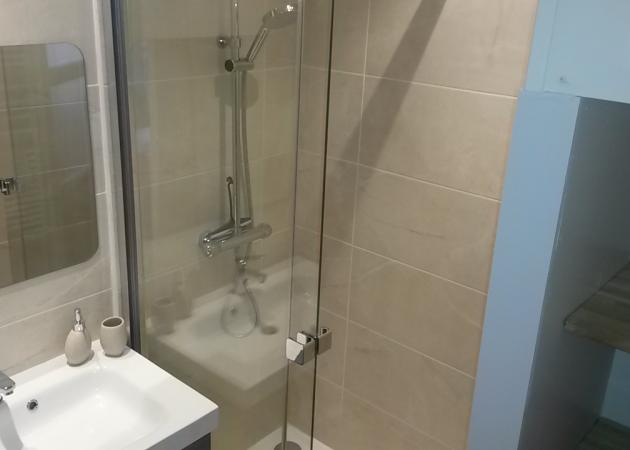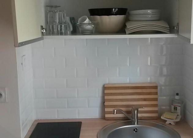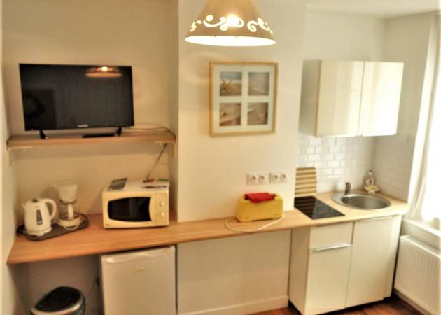 L’appartement est un deux pièces au 1er étage: une chambre en-suite spacieuse et une pièce à vivre (canapé, cuisine ouverte avec télévision. Cuisine avec 2 plaques à induction, bouilloire cafetière et frigo top.
