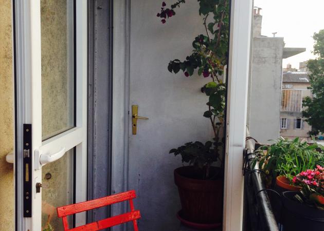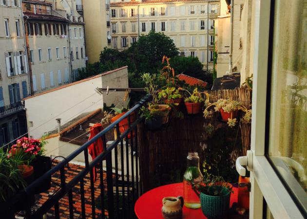 Petit balcon très agréable et donnant sur des jardins luxuriants et calmes entre le boulevard Longchamp et la rue Consolat. Immeuble de copains, quartier chouette, épicerie fabuleuse,tous commerces proches .