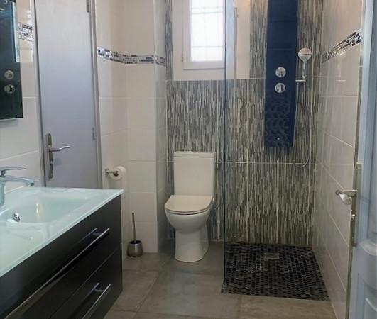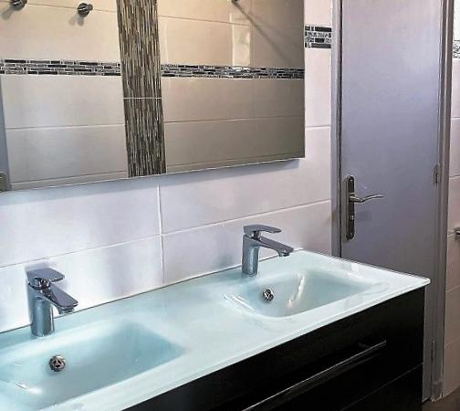 Description de la Chambre privative équipée : Lit 160 avec Chevets, Bureau, grand Placard-Penderie + Frigo & micrOnde fonction Grill, Bouilloire, LiveBox-Wifi / Lavabo double vasque & Douche à l'italienne-WC et un coin Salon-TV dans l'entrée...