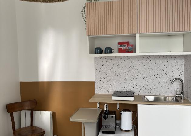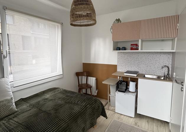 Petit mais parfaitement fonctionnel : vous y trouverez une salle de douche avec WC, coin cuisine d’appoint (évier, plaque à induction à brancher, micro-ondes), espace nuit/détente agréable.