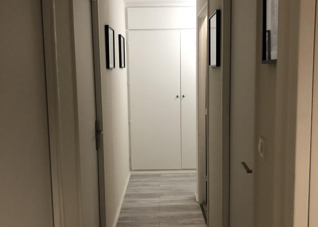 Partie commune de l’appartement : un séjour, une très belle salle de bain, 1 WC , une cuisine toute équipée, deux bureaux individuels pour pourvoir travailler tranquillement et deux très grands placards.