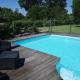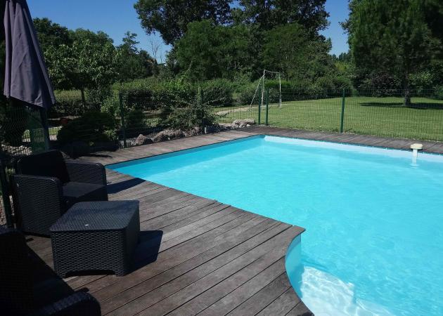 Terrasse extérieure, pelouse et accès à la piscine 8x5 m en libre service (espaces partagés avec moi seul)