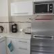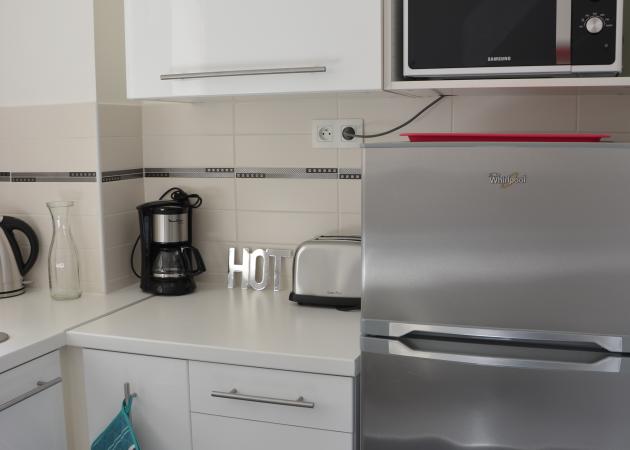 L’appartement est totalement équipé : dans la cuisine, vous trouverez une plaque de cuisson vitrocéramique, un four, un micro-onde, un réfrigérateur, une cafetière, une bouilloire, un grille-pain et tous les ustensiles de cuisine.
