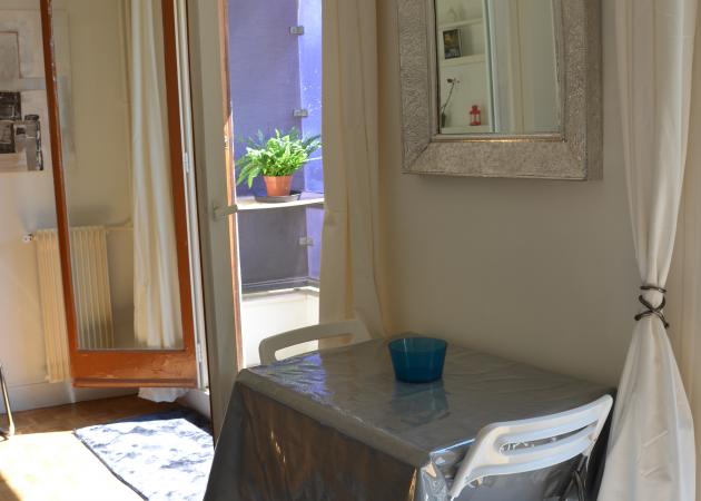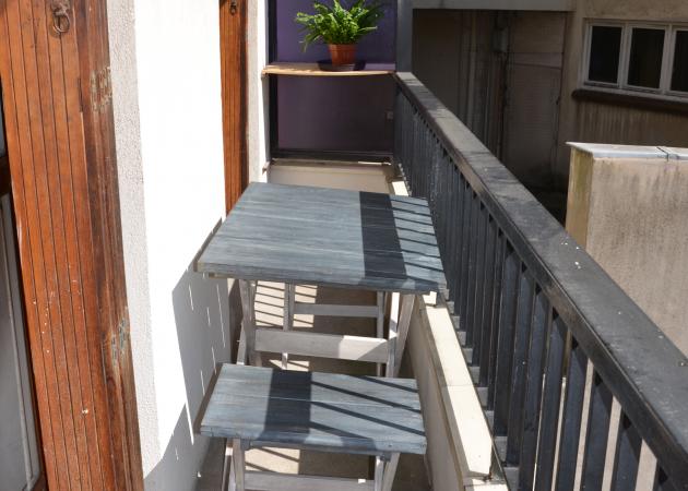 Sur le balcon, nous avons installé une table et deux tabourets pour profiter du soleil ou prendre le petit-déjeuner.