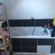~ Une salle de bain qui comporte toilettes, baignoire, lavabo et une machine à laver.
