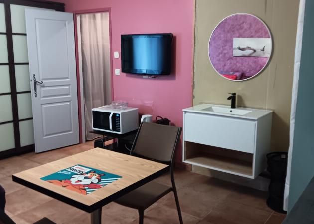Le studio est équipé d'un plan de travail avec évier et plaque gaz 2 feux, frigo top.