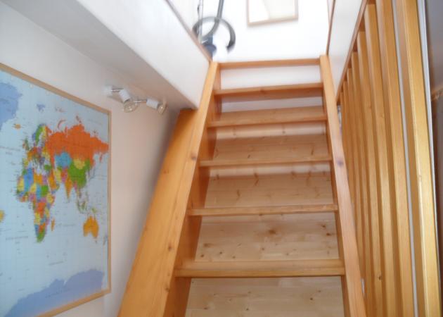 À l étage une chambre avec armoire penderie un lit double et un bureau.