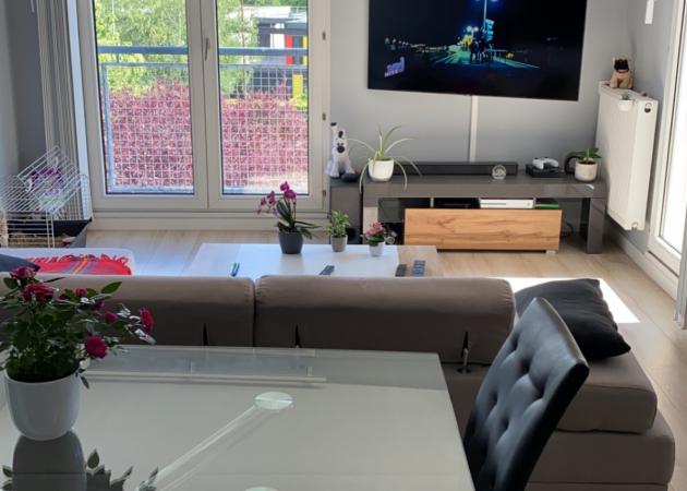 Un grand salon/séjour/cuisine ouverte commune de 34 m², et un balcon de 5,5 m² (avec vue les Vallée de Chevreuse et les champs du Château de Saint Jean de Beauregard) viennent compléter la location.