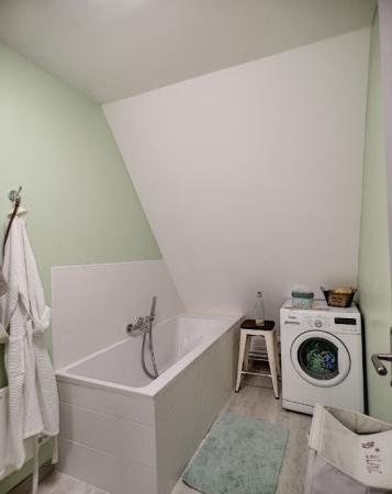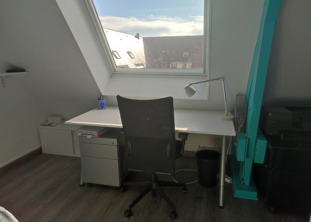 1 chambre de 10m2 équipée d'un lit 120x190 avec couette, oreillers, linge de lit et de toilette, bureau avec chaise, armoire. Une salle de bain avec baignoire est attenante à l'étage. Mise à disposition de la machine à laver.