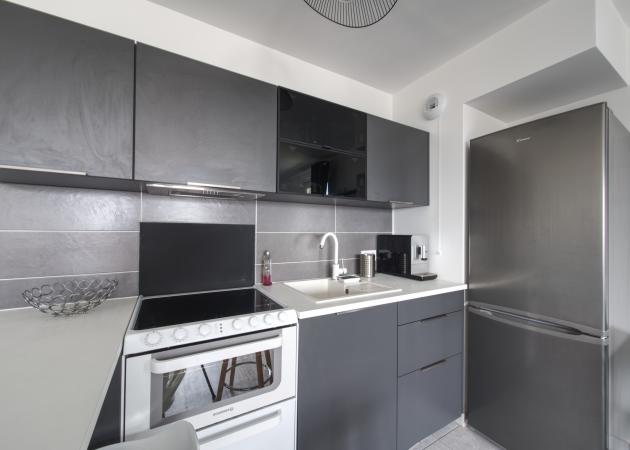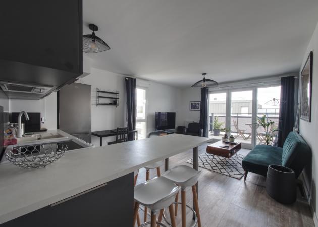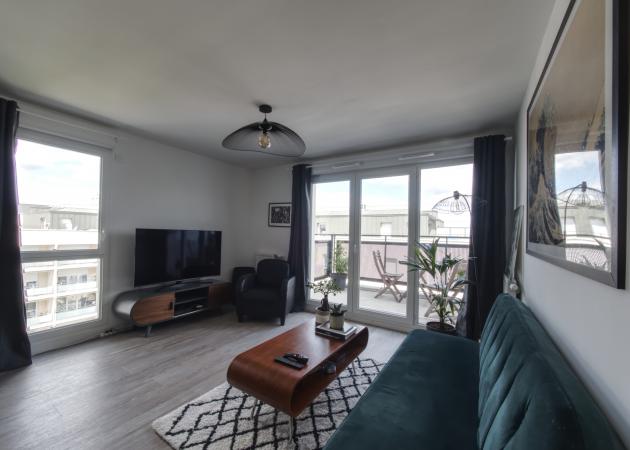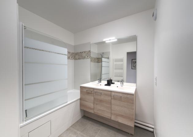 Dans appartement de 66 m² avec balcon de 5 m² - Partage de la salle de bain avec baignoire (4 m²), séjour avec cuisine (24m²)