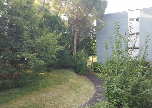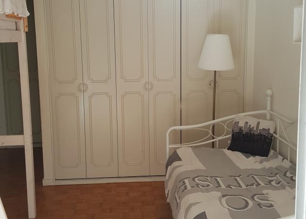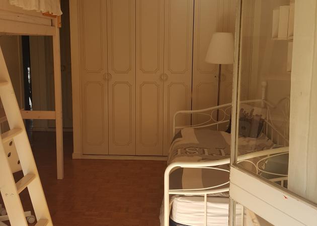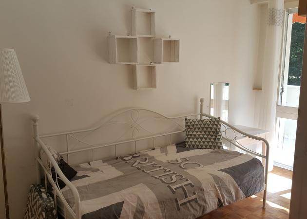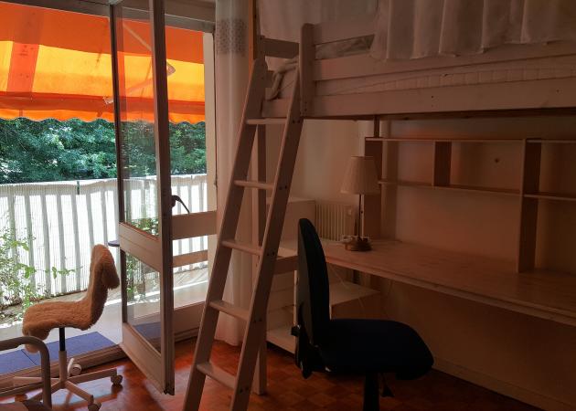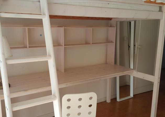 Le mobilier de la chambre comprend un lit-banquette 190x90cm, un grand bureau-lit mezzanine 190x90cm, des placards-penderie de 210x250x50 cm, [Coordonnées masquées], [Coordonnées masquées], [Coordonnées masquées]. Depuis la chambre on accède au balcon (côté est) avec vue sur le parc arboré.