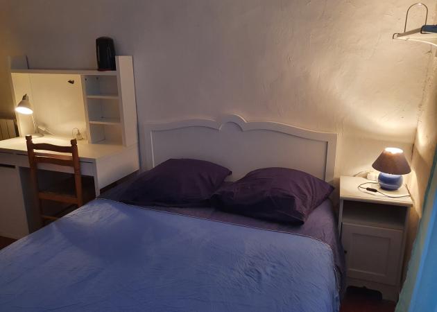 Elle possède un lit double, un chevet, un bureau avec sur-meuble, une armoire et une commode.