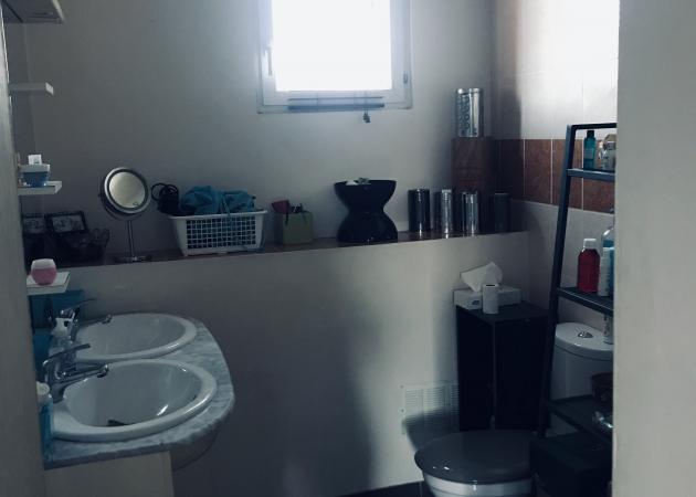 À l'étage, se trouvent deux chambres avec un sol en parquet stratifié. La salle d'eau est équipée d'un meuble avec double vasques, d'une douche, de WC et d'une fenêtre.