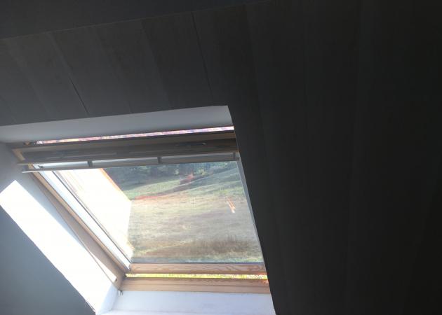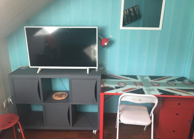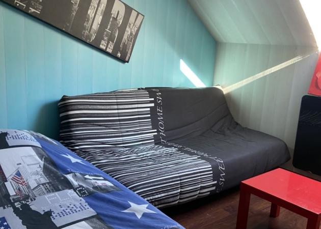 Chambre spacieuse + dressing, lit 2 places avec coin canapé + table basse, TV et bureau. Grand velux.
