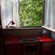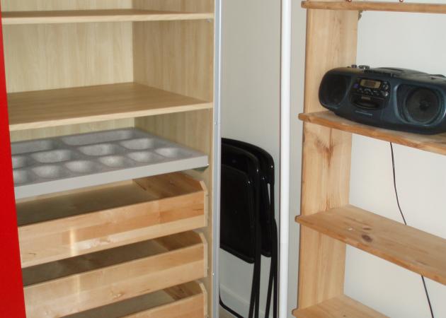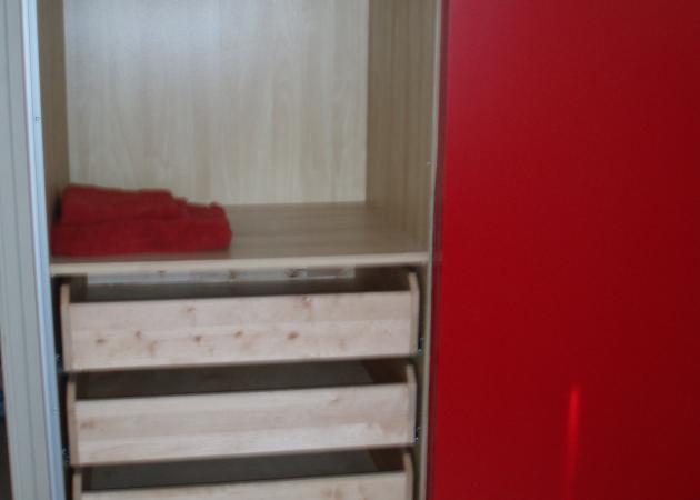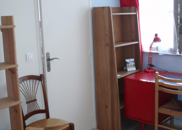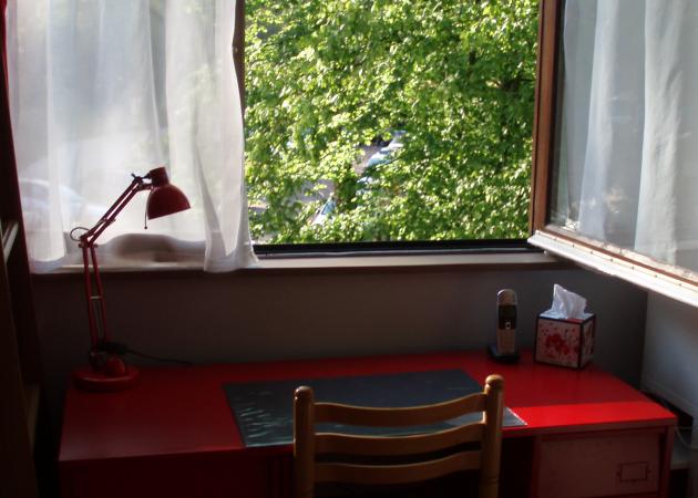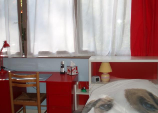 La chambre dispose de fenêtres donnant sur de beaux arbres, de rideaux (voilages et rouges), d'un grand bureau d'étudiant, d'un lit simple de bonne qualité et d'une grande armoire avec une penderie disposant de nombreux tiroirs coulissants.