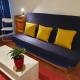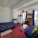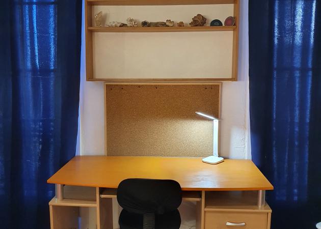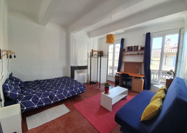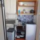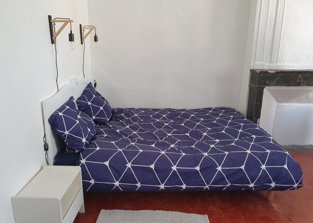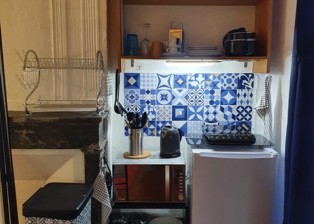 Située au 2ème étage, la chambre possède un lit double, un coin cuisine avec plaque à induction, frigo, four à micro-ondes et bouilloire électrique (la vaisselle se fait dans la salle d'eau : le robinet est muni d'une douchette permettant de remplir aisément la bassine)