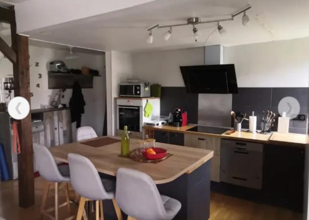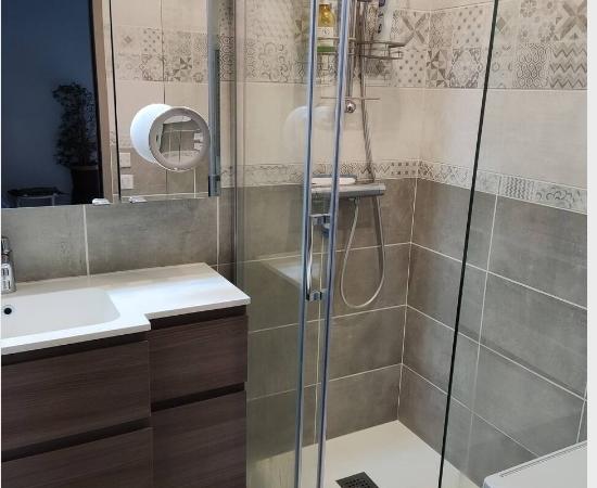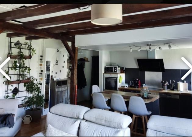 Vous avez accès au salon, à l'espace cuisine entièrement équipée, la salle d'eau, un WC séparé, et l'ensemble fait 70m2 au total.