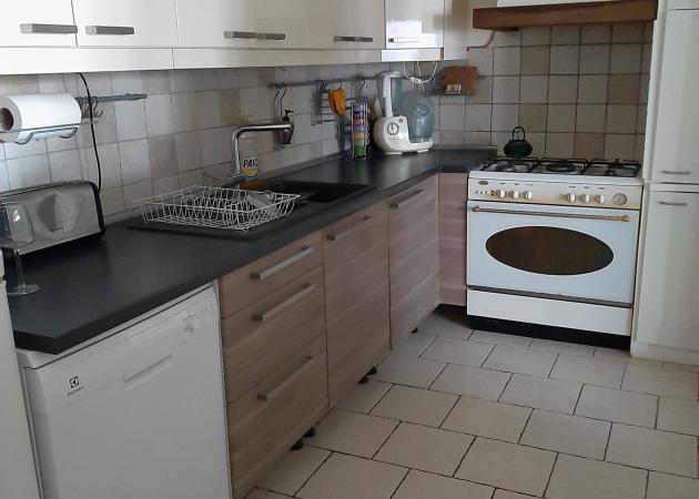 Rez-de-chaussée commun et meublé : salon, salle à manger, cuisine équipée et lave-vaisselle, cellier et lave-linge, wc.