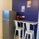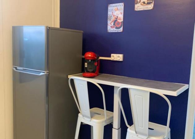 UNE GRANDE CUISINE ÉQUIPÉE avec : Réfrigérateur, congélateur, four, four à micro-ondes, plaques de cuisson à induction, Lave-Linge, & UN BAR et ses tabourets pour l’Apéro.