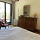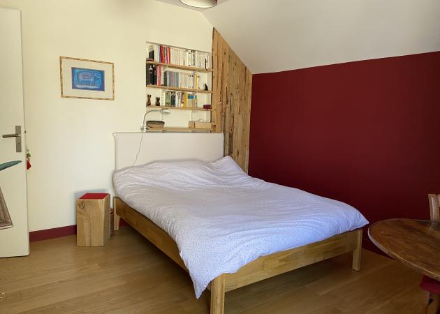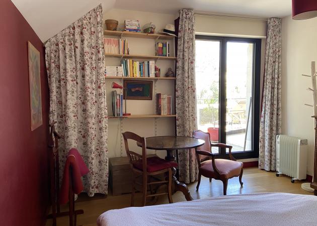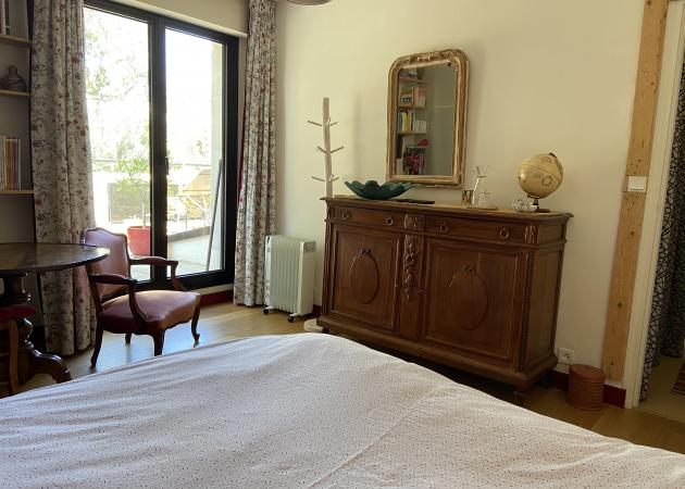 La chambre s’ouvre sur une terrasse meublée et fleurie côté jardin.