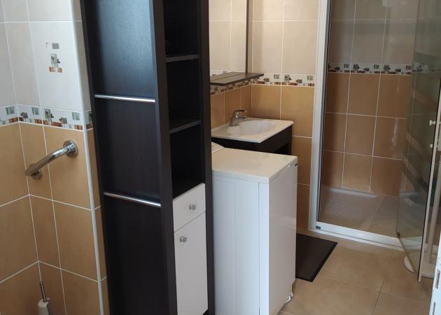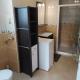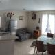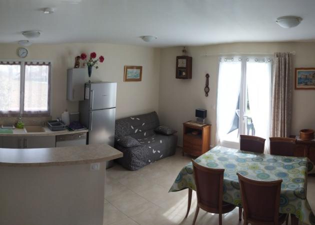 Sanitaires: 1 Gdre douche - lavabo - WC - rangements - sèche-cheveux - lave-linge - Etendoir extérieur à disposition. Chambre, 1 lit 140 pour 2 adultes - Armoire + placard avec penderie, 1 planche à repasser, 2 chevets. Pièce de vie avec cuisine américaine, plaques 4 feux gaz - four électrique et micro-ondes - bouilloire - cafetière - frigo avec compartiment congélateur - nécessaire cuisson, vaisselle - lave-vaisselle - canapé BZ - TV - poste radio - tables, chaises buffet et petits meubles.