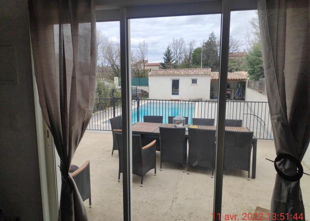 À l'extérieur, une belle terrasse équipée d'une très grande table donnant sur