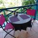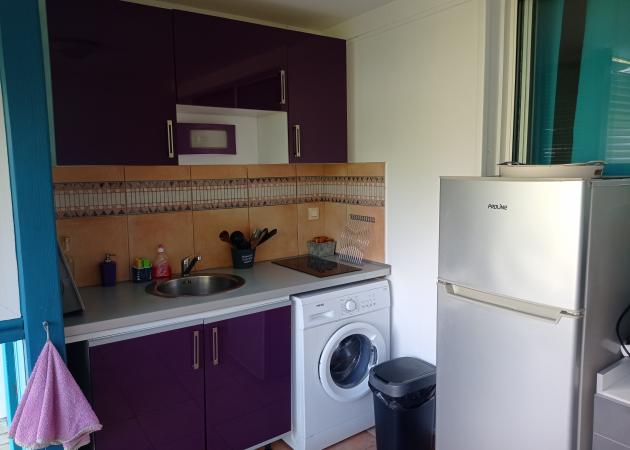 CUISINE : lave linge, four grill micro ondes, frigo-congélateur, bouilloire, cafetière Senseo, plaque vitrocéramique, grille pain, ventilateur sur pied. Elle se situe sur la terrasse extérieure protégée par un store avec vue sur le jardin de la résidence. Entièrement équipée des ustensiles de cuisine et vaisselle courante.