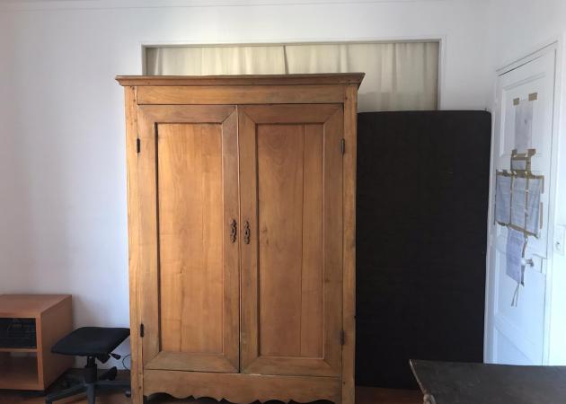 La chambre est dans un ensemble de 25m2. Cet ensemble est coupé en 2 par une cloison partielle (1.5m de long) et un rideau épais (2.1 mètres de long). L'autre partie est constitué du séjour, espace commun aux différentes personnes dans l'appartement.