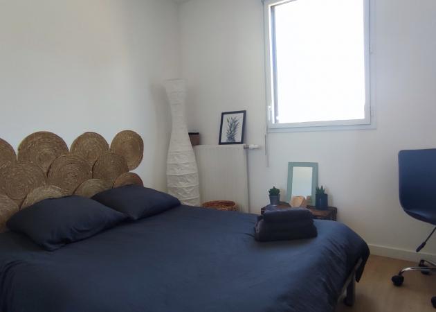 - un salon-sejour avec cuisine équipée (frigo, plaque, four, lave-vaisselle, cafetière, bouilloire, grille-pain) et accès au balcon