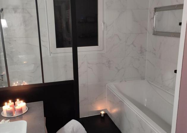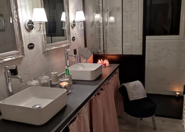 Vous avez acces a notre salle de bain 2 vasques une douche une baignoire et a nos wc.