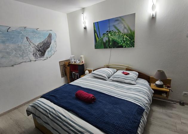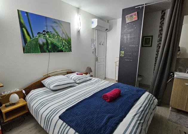 POSSIBILITE EXEPTIONNELLE DE LOGER 1 OU 2 NUITS UN 1 ou 2 personnes en plus, souvent voyageant ensemble. 2EME CHAMBRE PRIVEE CHEZ NOUS A PAYER SUR PLACE SANITAIRES COMMUN AVEC NOUS. OBLIGATION DE PRESENCE DES PROPRIETAIRES. 40 € (Photo de la chambre mur vert et tableau orange et la salle de bain commune)