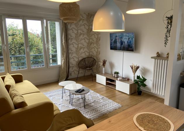 Séjour aménagé : Canapé 3 places, tables basses, Smart TV 55 pouces, meuble TV, box internet.