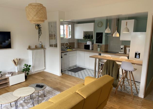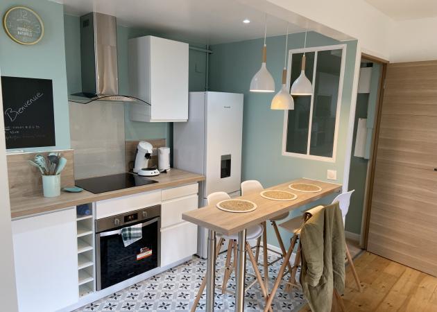 Cuisine entièrement équipée : plaque de cuisson 4 feux, four, micro-onde, frigo, congélateur, lave-vaisselle, bouilloire, vaisselle, casseroles, couverts.