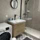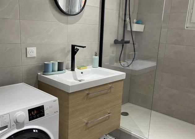 Salle de bain : Douche, meuble de salle de bain, lave-linge, sèche-linge, miroir, rangement.