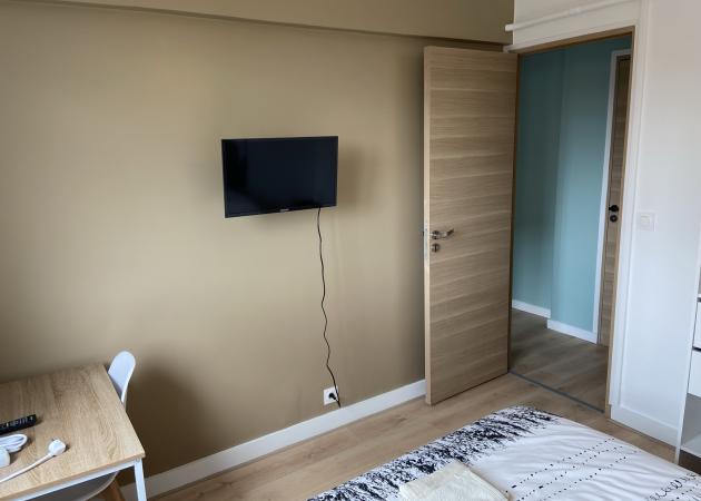 Chambres : Lit 140*190, bureau et chaise de bureau, armoire, table de chevet et lampe, linge de maison (drap, housse, couette, oreiller, taie d’oreiller), TV