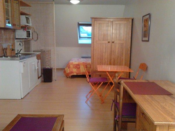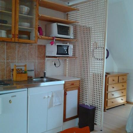 - un coin repas avec cuisinette équipée d'un frigo, micro-ondes, plaques électriques