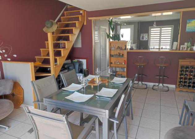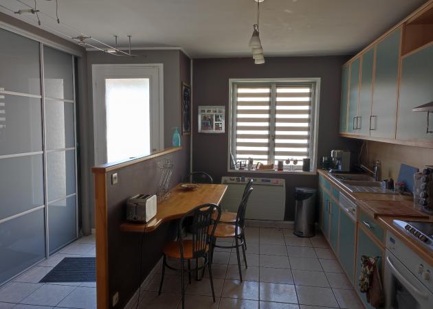 - entrée avec placard, wc, cuisine aménagée et équipée ouverte sur séjour, terrasse et petit jardin clos (barbecue)