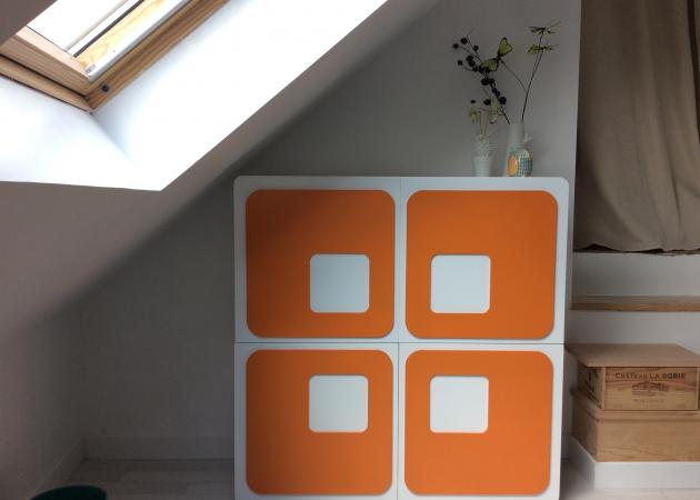- une commode assortie au bureau, laquée blanc et orange, neuve