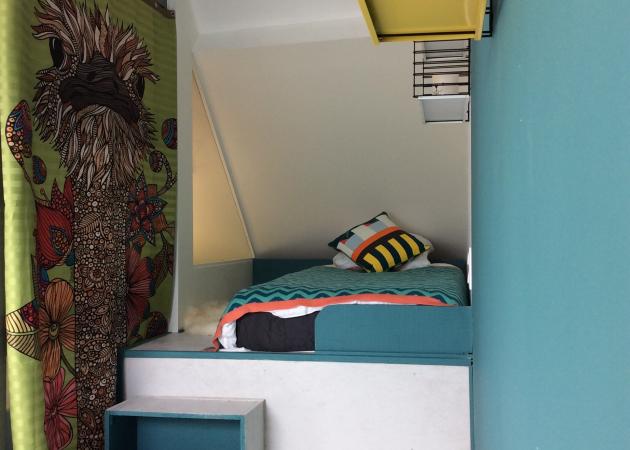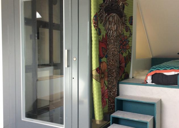 - un grand rideau assorti à celui de la penderie sur l’autre paroi de l’ascenseur