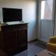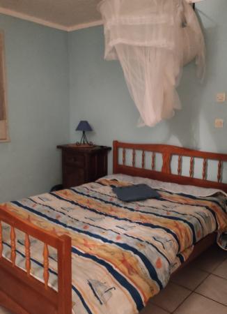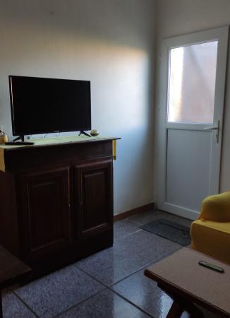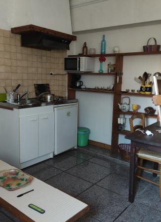 cuisine avec necessaire (assiettes etc )micro ondes deux plaques électriques ,frigo,télé ,banquette ;chambre lit en 140,armoire ,bureau ,coin toilettes et douche ,réduit de rangement