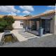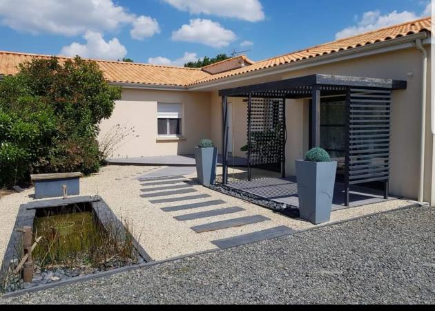 Grande baie vitrée donnant sur une terrasse avec table et chaises extérieures.