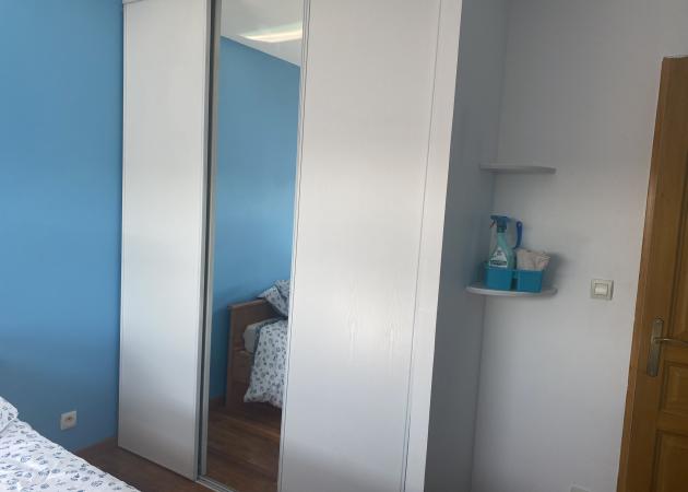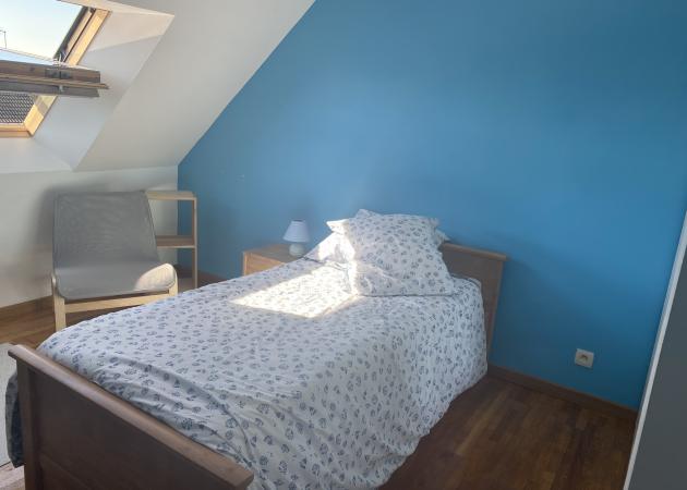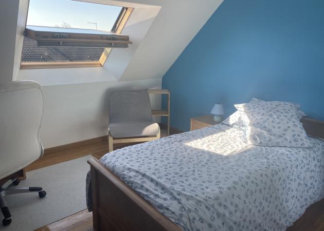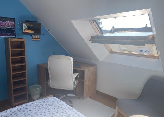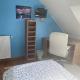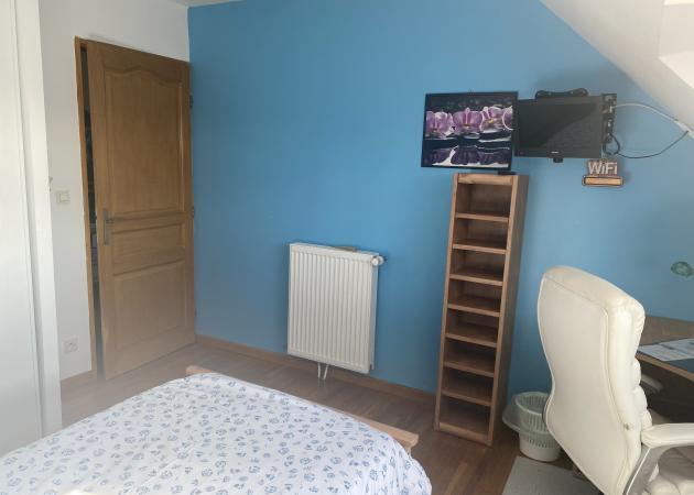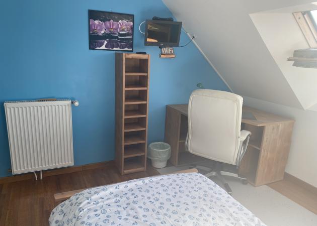 Elle se compose d’un lit 90x190 avec chevet, d’un placard dressing, d’un bureau d’un fauteuil, et d’une télé écran plat.