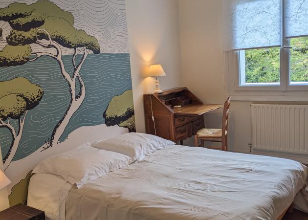 La chambre est orientée ouest sur des jardins.avec attenante une salle d'eau (douche à l'italienne,lavabo sur vasque et WC ).