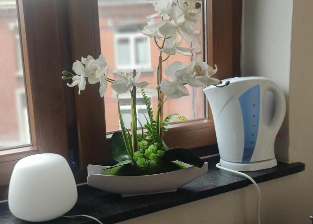 Chambre lumineuse et agréable de 20 m² située au 1er étage d’une maison unifamiliale avec 1 lit d’une personne comprenant 1 TV, frigo, 1 micro-onde, 1 plaque de cuisson, casseroles,1 garde de robe, 1 fauteuil, 1 grille-pain, 1 bouilloire électrique, 1 machine à café, un service de vaisselle comprenant tasses, assiettes, bols, 1 plateau et des couverts. Le wifi est disponible.
