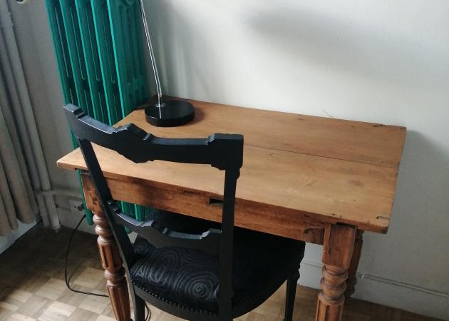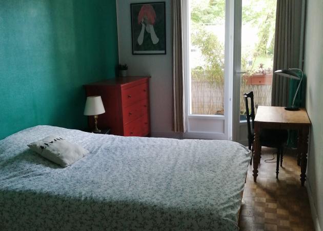 Lit double, bureau avec fauteuil, nombreux rangements.